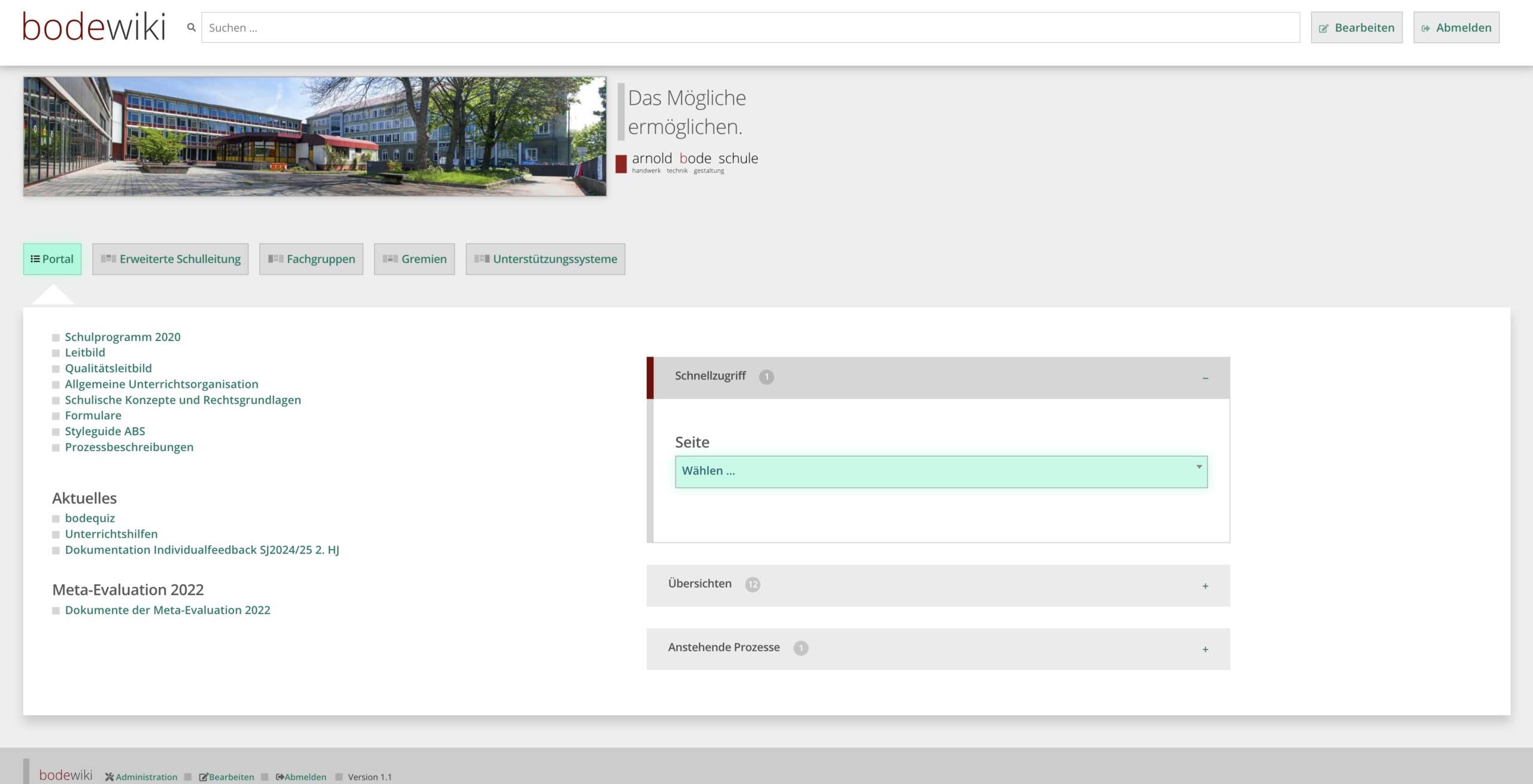 Das bodewiki ist die Lösung der Arnold-Bode-Schule (ABS) für das schulische Qualitätsmanagement, Unterrichtsorganisation, Curriculare Arbeit, Projektmanagement und Evaluation. Das bodewiki wird seit dem Jahr 2018 an der Schule entwickelt und betrieben. Es ist eine kooperative Plattform für das gesamte Kollegium und wird von allen Kolleginnen und Kollegen der ABS täglich genutzt. Das bodewiki wird seit Beginn kooperativ mit dem Personalrat unter ständiger Mitbestimmung und ebenso aller weiteren schulischen Gremien entwickelt.