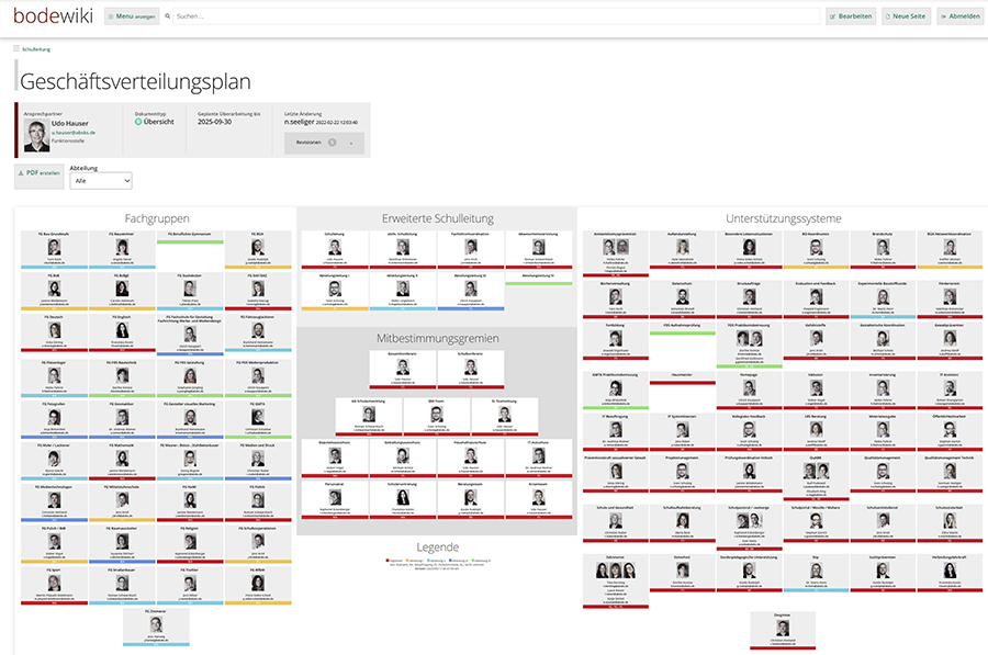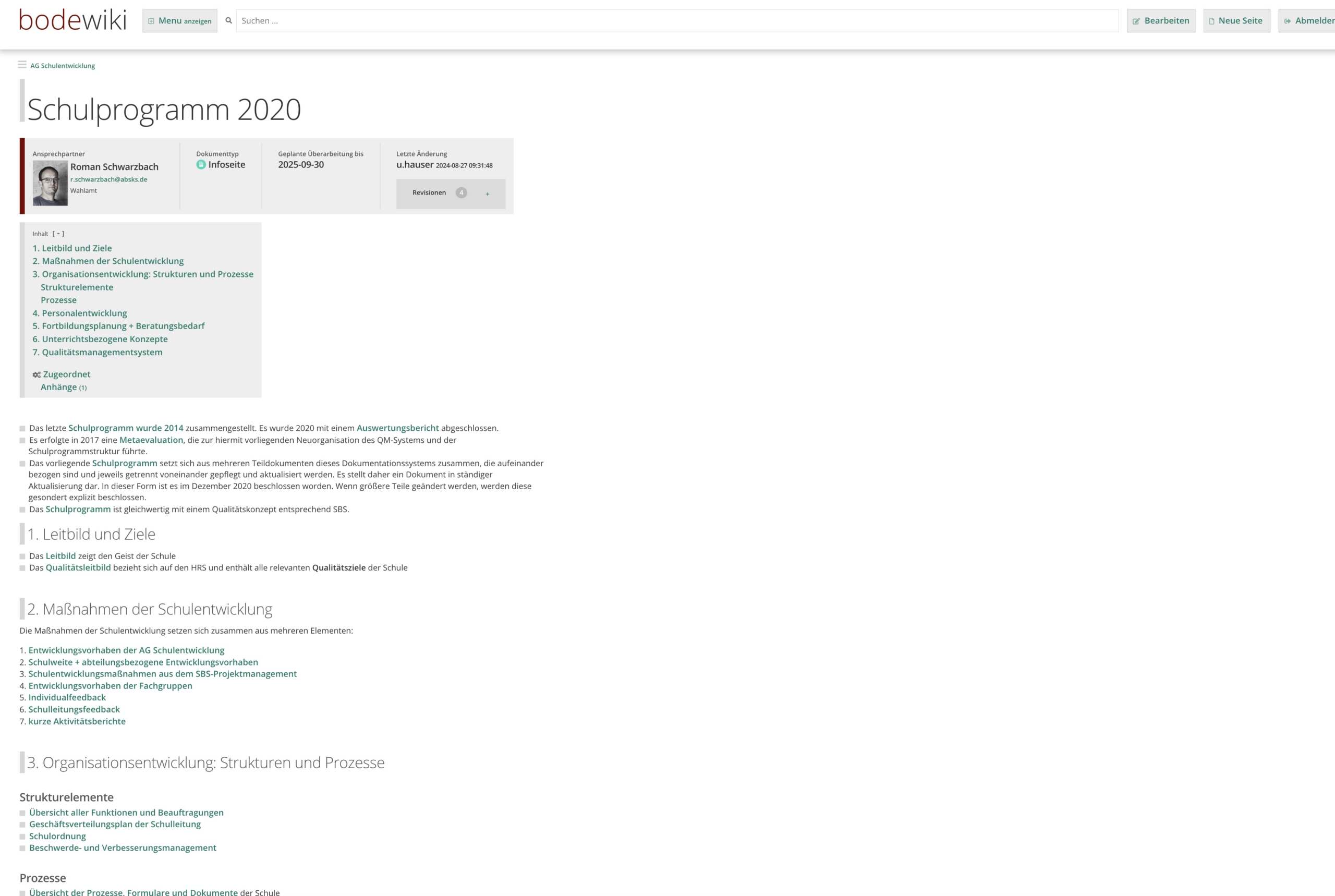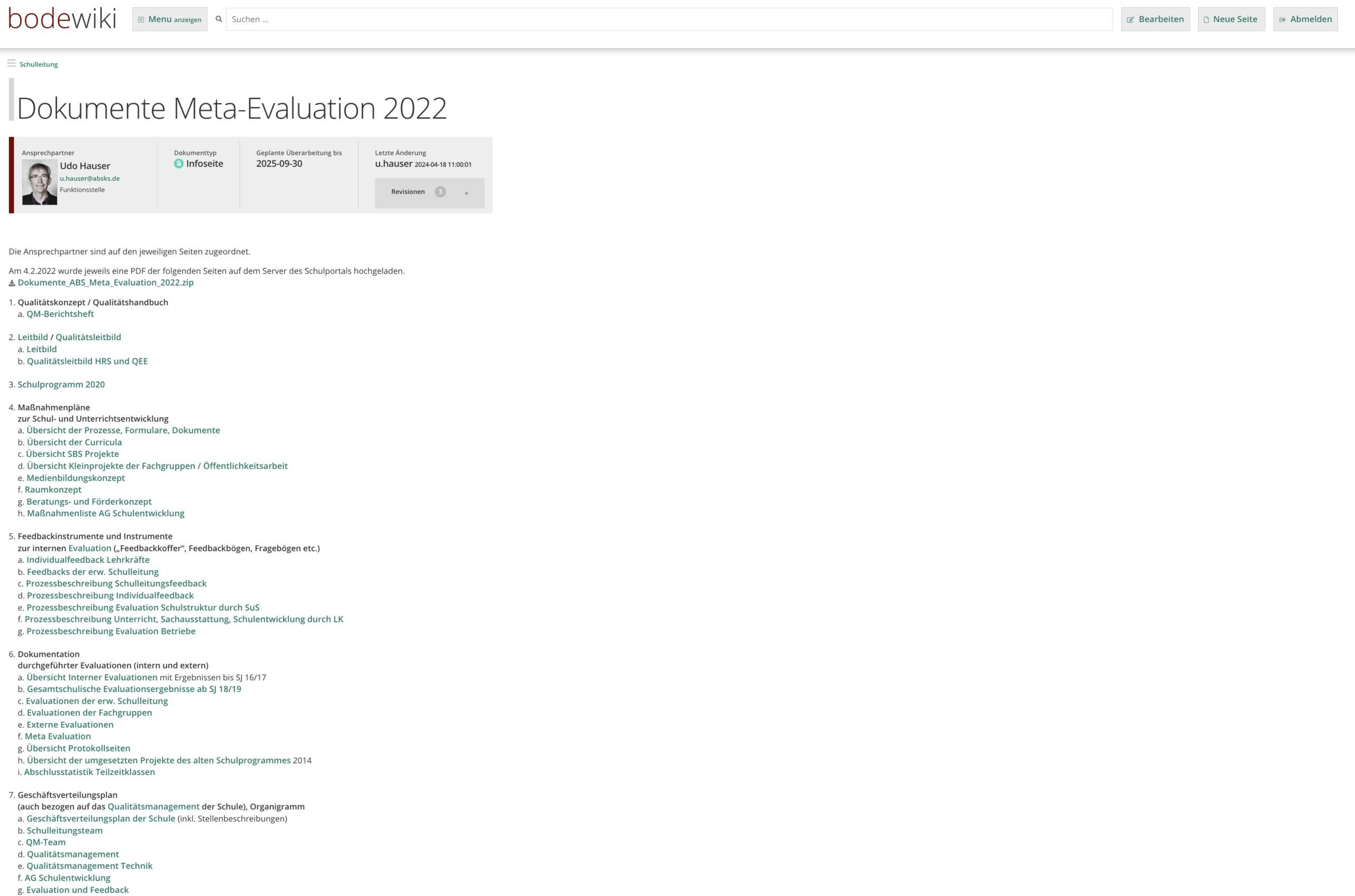 Das bodewiki setzt auf die ganzheitliche Integration des gesamten Kollegiums, um Engpässe im Qualitätsmanagement zu verhindern und ein gemeinsames Verständnis für Prozesse und Schulentwicklung zu schaffen. Adaptive Menüs, klare Verantwortlichkeiten und automatisierte Übersichten gewährleisten schnellen Zugriff und unterstützenden überlappende etablierten PDCA-Zyklen.